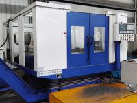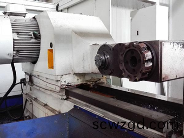 火车钩尾框承载面加工专机,本机床为卧式单面布置,前面数控移动工作台上安装有回转夹具,后面数控移动工作台上配有专用双轴铣削动力头。夹具具有自动回转及回转到位后自动锁紧功能,回转角度由固定挡铁控制,更换品种时需更换挡铁块。本机床主要用于13B、17型、力拓40T钩尾框承载面的铣削加工,生产节拍:4分钟/件。工件以底面、侧面及尾部定位,液压油缸夹紧。人工吊装上下料,一次一件,液压夹紧,数控系统控制,并配有独立的液压站、电气柜、集中润滑装置。本机床加工刚性好,并适合多品种加工。